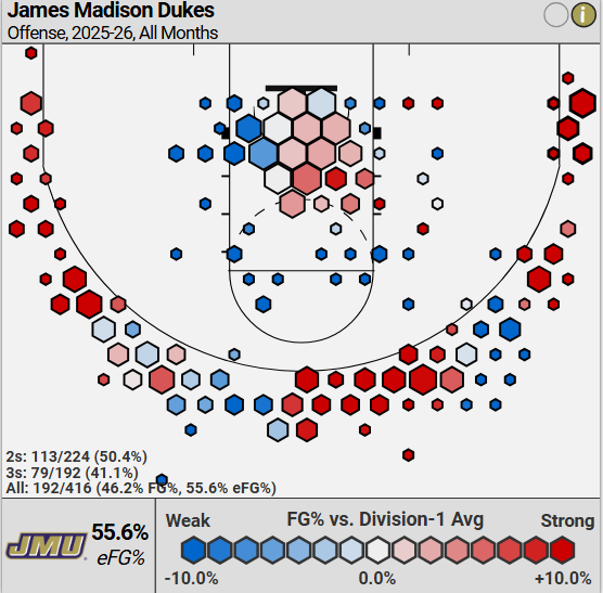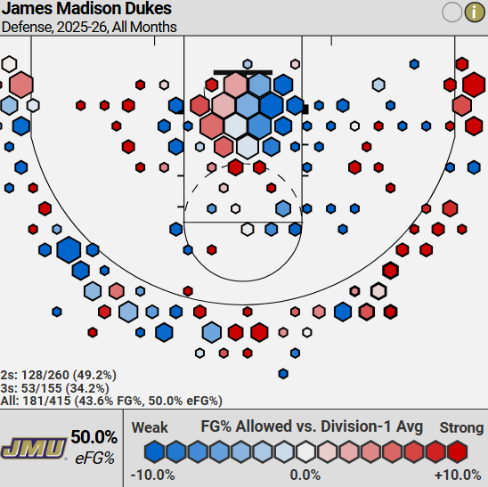 This doesn’t look like the shot chart that you would expect from a sub-300 defense, but it makes a lot more sense when you look at how weak the offenses they’ve played are. JMU gave up a point per possession to the worst offense in the country in Coppin State.