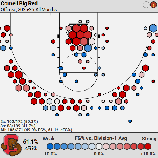 This offense is extremely heavily reliant on the three ball. They shoot the fifth most threes in the country on a per-attempt basis at 53.6% of shots being threes, and Cornell is making 41.7% of them, 9th highest. They get the 2nd most percentage of their points from deep in the country at 45.6%. Along with that, the two isn’t getting neglected, as the Ivy League squad is making 59.3% of those as well, 38th. This comes together to give the Big Red the 9th highest eFG percentage in the country at 61.1%.