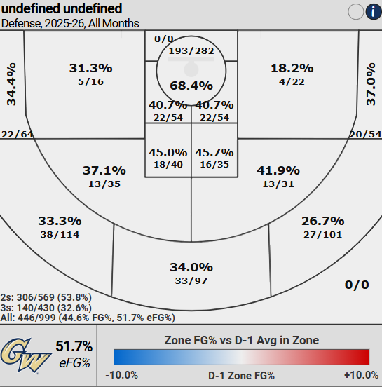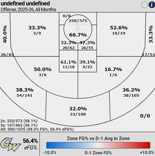GW gets their eFG% from making 36.1% of their threes, 61st, and 58.1% of their twos, 32nd. They take 44.6% of their shots from behind the arc, 77th highest, and 4.9 percentage points above average.