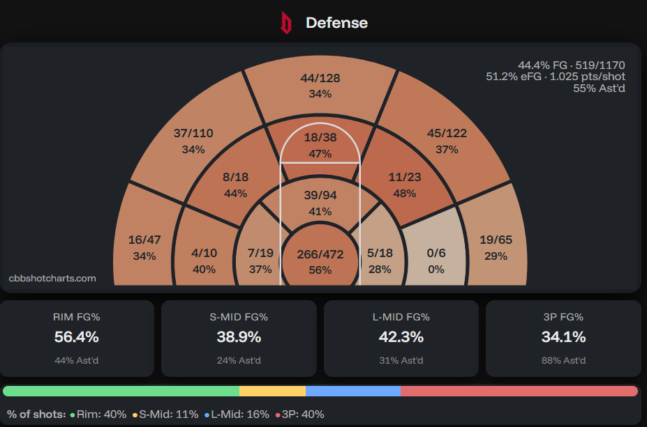 That eFG% comes from the 4th lowest three-point percentage at 33%, and teams taking 42.8% of their shots from back there, fifth most. Opponents do make 52.8% of their shots, which is high for how good their rim defense is.