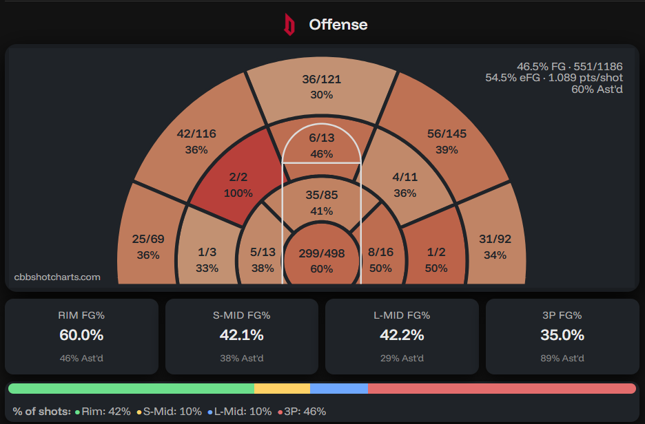 The low midrange volume is pretty good, it does seem like they love the wing threes over the corners, on both higher volume and efficiency. 60% at the rim isn’t too good, which explains the two-point struggles. At least they’re getting shots at the rim, with their average two-point distance being 5 feet, fifth best in the conference.