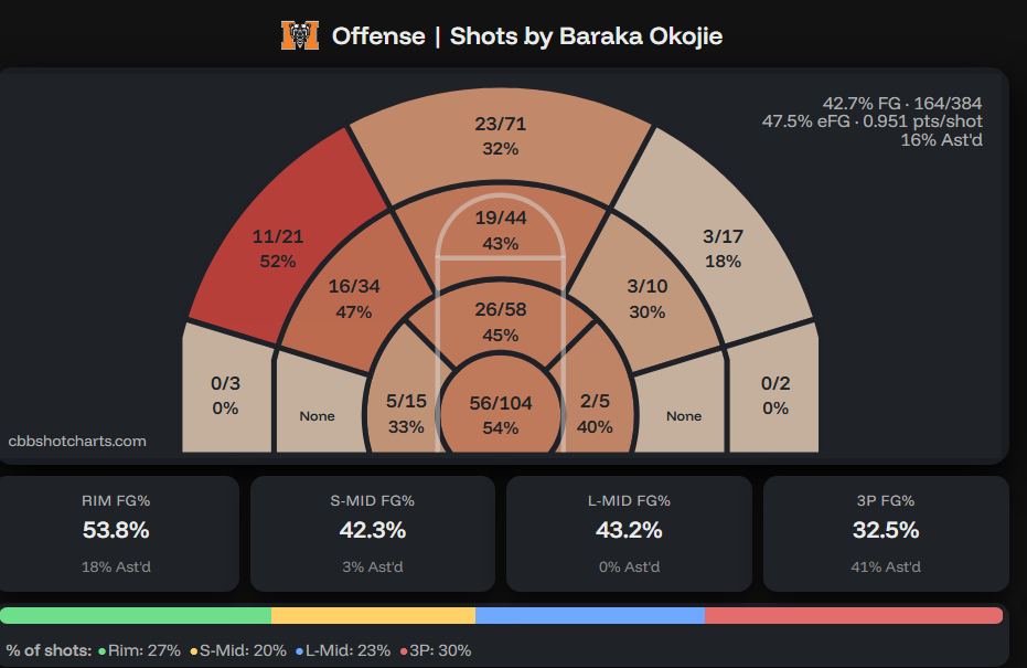 Playmaking: 60 – Since he is projecting to be the primary playmaker, this will include his passing. A 28.5% assist rate and a 15.5% turnover rate is great for an offensive engine like Okojie. Not only does he score of his rim pressure, he creates for others. This would be a 65 without accounting for the turnover rate thing I mentioned earlier.